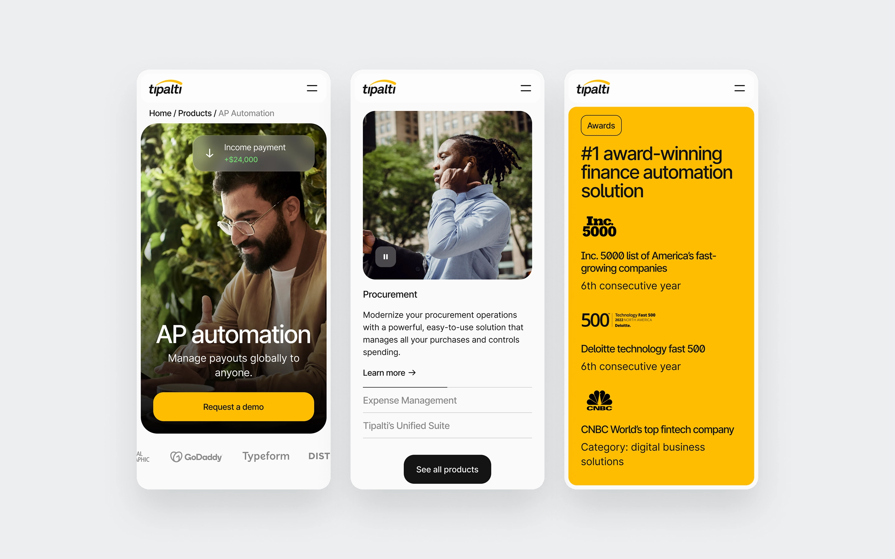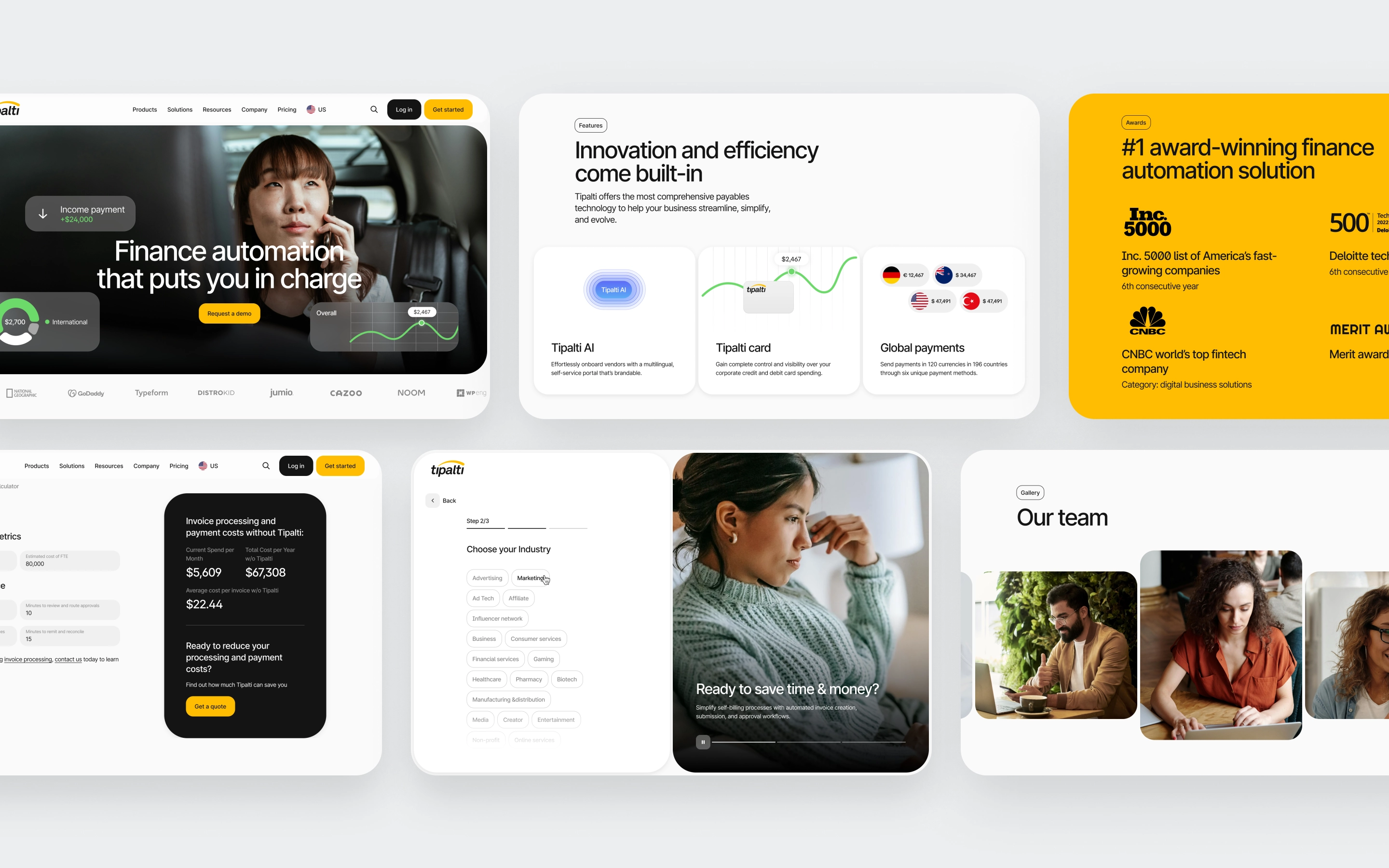 Tipalti is a US-based finance automation company. Working together with Clay team, we redesigned their marketing website—from content structure and wireframes to visual design and a scalable design system. The project was nominated for a Webby Award as a best mobile design and functionality website.